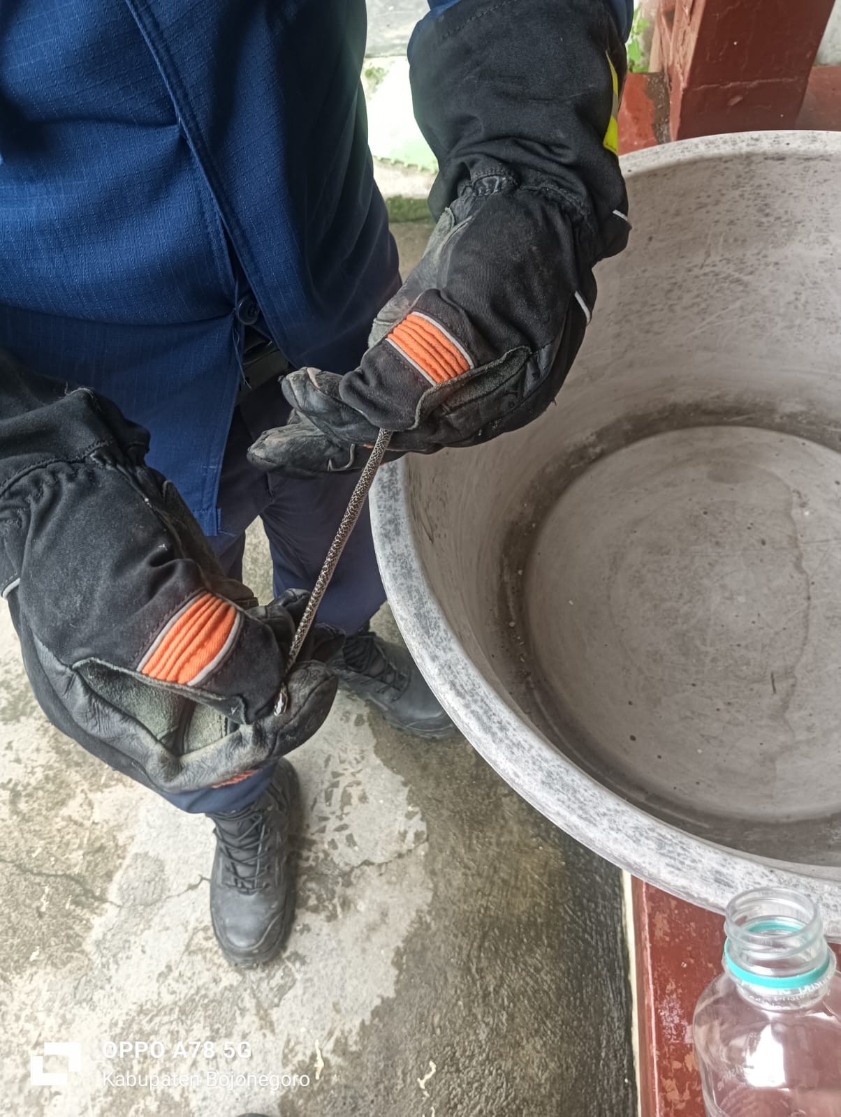 BOJONEGORO — Dinas Pemadam Kebakaran dan Penyelamatan Kabupaten Bojonegoro melalui Pos Bantu Ngambon Regu 2 melaksanakan evakuasi seekor ular yang masuk ke lingkungan permukiman warga di Desa Kacangan, Kecamatan Tambakrejo, Kabupaten Bojonegoro.