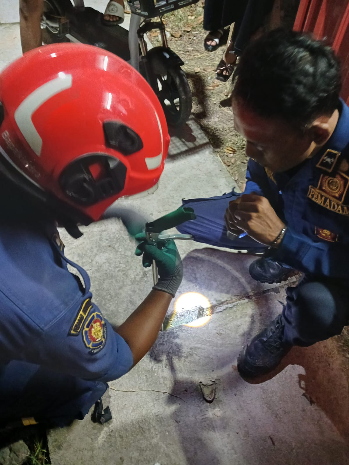 Menindaklanjuti laporan tersebut, petugas Damkarmat Pos Ngraho segera menuju lokasi untuk melakukan penanganan. Proses evakuasi dilakukan dengan menggunakan alat penjapit ular guna memastikan pengambilan dompet berlangsung aman dan tidak menimbulkan risiko bagi petugas maupun warga sekitar.