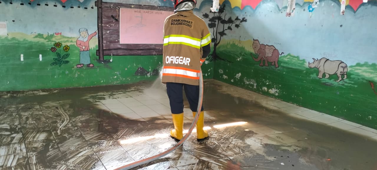 BOJONEGORO – Dinas Pemadam Kebakaran dan Penyelamatan (Damkarmat) Kabupaten Bojonegoro melalui Pos Ngasem Regu 2 melaksanakan kegiatan penyemprotan lumpur pasca hujan deras di lingkungan TK Pertiwi, Dusun Krajan, Desa Butoh, Kecamatan Ngasem.