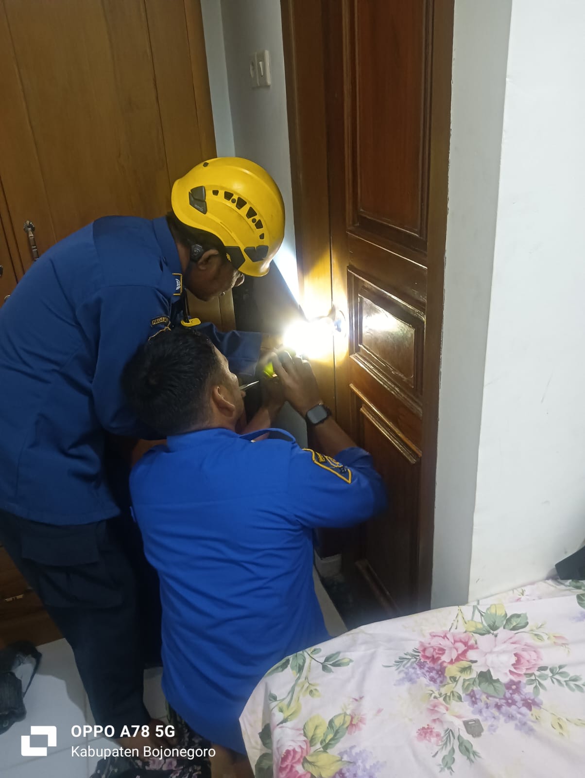 BOJONEGORO – Dinas Pemadam Kebakaran dan Penyelamatan (Damkarmat) Kabupaten Bojonegoro melalui Regu 3 Pos Kota melaksanakan penanganan nonkebakaran berupa pembukaan pintu kamar mandi milik warga yang mengalami kerusakan kunci.
