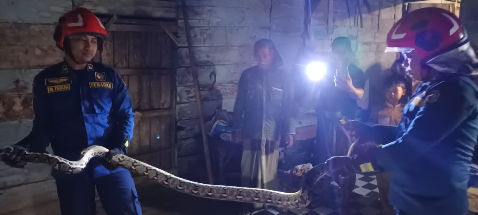 BOJONEGORO – Dinas Pemadam Kebakaran dan Penyelamatan (Damkarmat) Kabupaten Bojonegoro melalui Pos Bantu Temayang Regu 2 melaksanakan kegiatan evakuasi ular di wilayah permukiman warga Dusun Kedunggampeng, Desa Temayang, Kecamatan Temayang.
