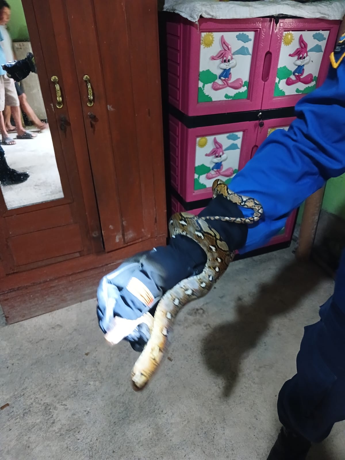 Menindaklanjuti laporan tersebut, petugas Damkarmat Pos Kedungadem segera menuju lokasi dan melakukan penanganan secara cepat dan terukur. Dari hasil evakuasi, petugas berhasil mengamankan satu ekor ular jenis sanca batik dengan panjang kurang lebih 80 sentimeter.