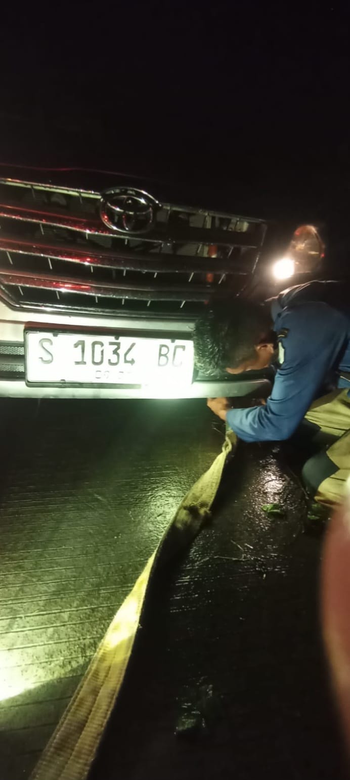 Kendaraan jenis Toyota Kijang Innova dengan nomor polisi S 1034 BC tersebut diketahui milik warga berinisial H. (41 th), seorang wiraswasta asal Kecamatan Temayang. Kendaraan dilaporkan terperosok sehingga tidak dapat melanjutkan perjalanan dan berpotensi mengganggu arus lalu lintas.