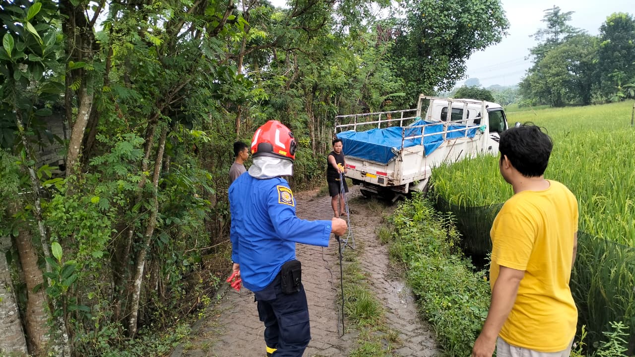 Menindaklanjuti laporan tersebut, petugas Pos Ngasem segera menuju lokasi dengan mengerahkan satu unit fire truck dan tiga personel. Setibanya di lokasi, tim langsung melakukan asesmen serta proses evakuasi kendaraan yang terperosok hingga berhasil dikeluarkan dalam kondisi aman.