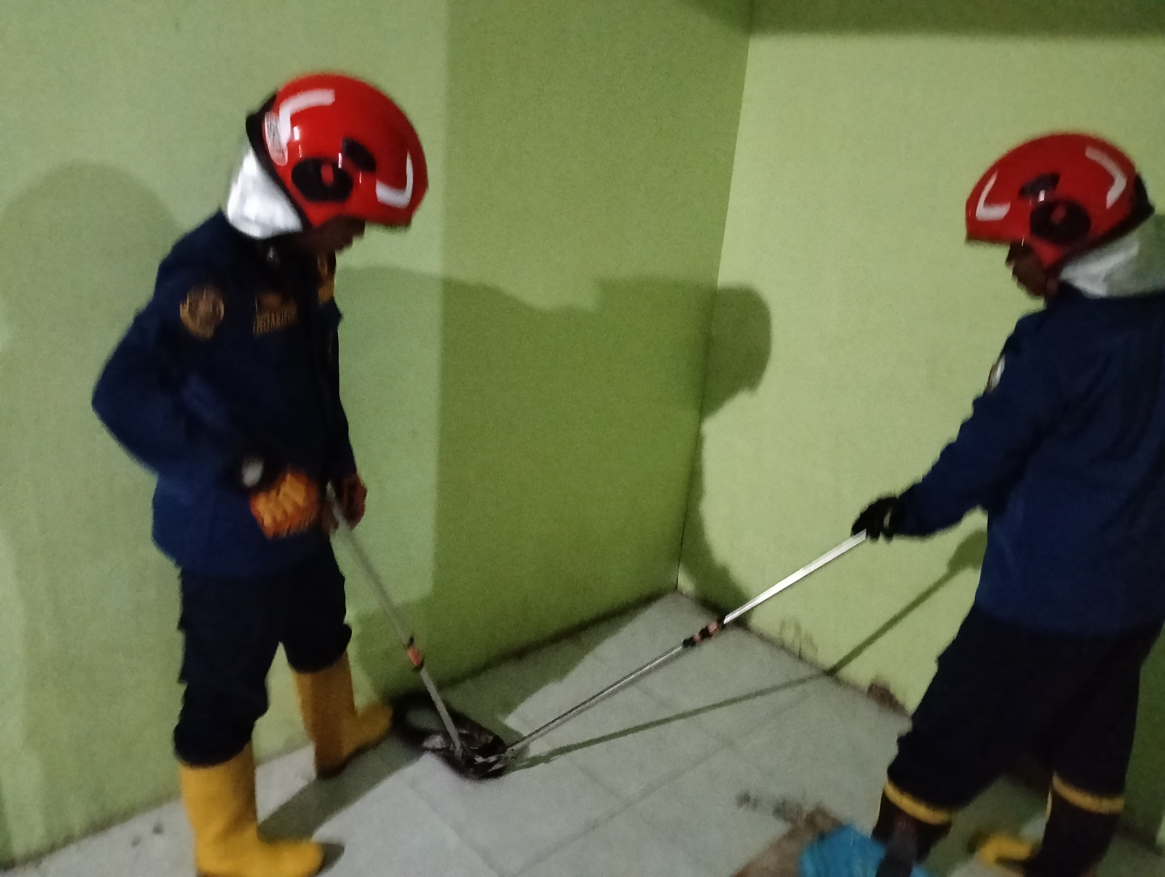 Dinas Pemadam Kebakaran dan Penyelamatan Kabupaten Bojonegoro melalui Pos Ngasem Regu 2 melaksanakan evakuasi seekor ular di wilayah Desa Ngasem, RT 012 RW 004, Kecamatan Ngasem, Kabupaten Bojonegoro, Sabtu (7/3/2026).