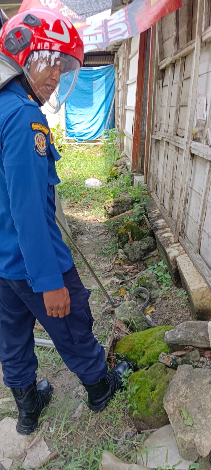 Dinas Pemadam Kebakaran dan Penyelamatan Kabupaten Bojonegoro melalui Pos Ngambon Regu 1 melaksanakan evakuasi seekor ular di permukiman warga Desa Kacangan, RT 006 RW 002, Kecamatan Tambakrejo, Kabupaten Bojonegoro, Senin (9/3/2026).