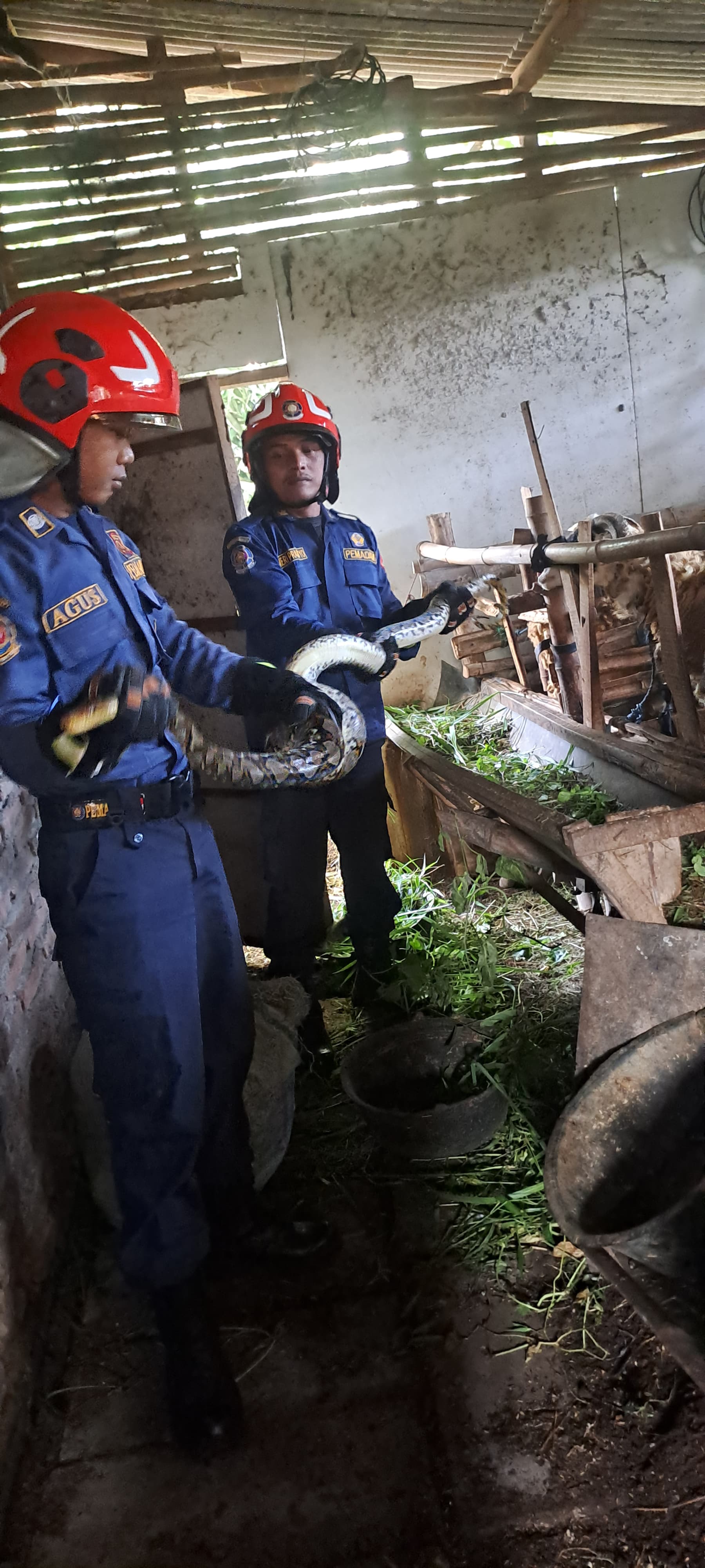 Bojonegoro — Dinas Pemadam Kebakaran dan Penyelamatan Kabupaten Bojonegoro melalui Pos Sumberrejo melakukan penanganan dan evakuasi seekor ular piton yang ditemukan di area permukiman warga di Dusun Lemahbang Cepit, RT 12 RW 02, Desa Margomulyo, Kecamatan Balen, Kabupaten Bojonegoro.