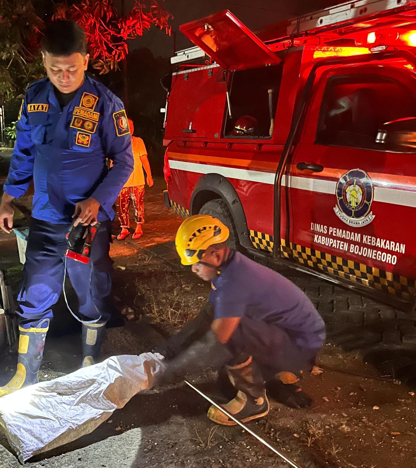 Bojonegoro — Dinas Pemadam Kebakaran dan Penyelamatan Kabupaten Bojonegoro melalui Pos Kota melaksanakan evakuasi seekor ular yang ditemukan di lingkungan permukiman warga di Desa Sukowati, Dusun Glagah, RT 05 RW 01, Kecamatan Kapas, Kabupaten Bojonegoro.