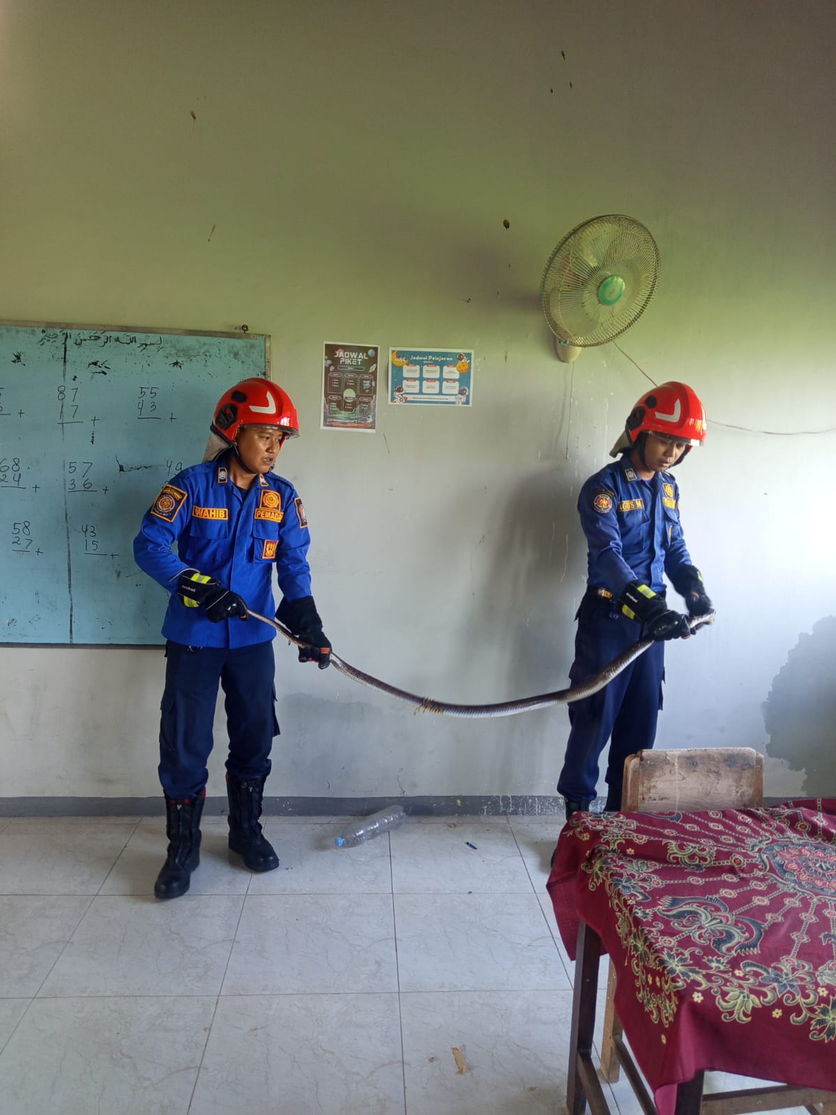 Bojonegoro – Dinas Pemadam Kebakaran dan Penyelamatan Kabupaten Bojonegoro melalui Pos Sumberrejo Regu III melaksanakan penanganan laporan keberadaan ular di lingkungan SDN Penganten 2, Dukuh Jati Cilik, Desa Penganten, Kecamatan Balen.