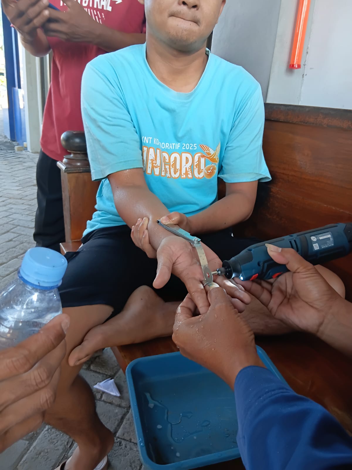 Proses evakuasi dilakukan menggunakan alat mini gerinda untuk memotong cincin yang melingkar pada jari korban. Petugas memastikan tindakan dilakukan secara presisi guna menghindari risiko cedera.