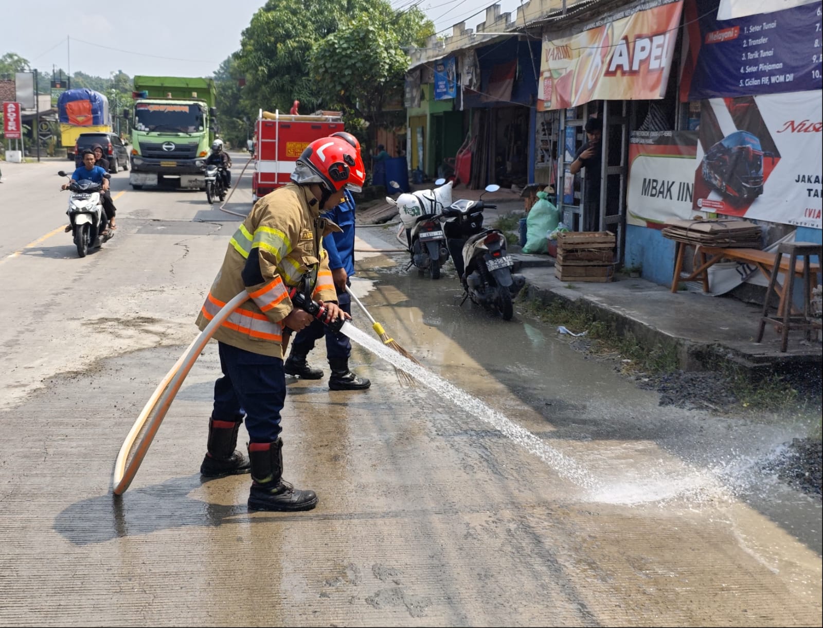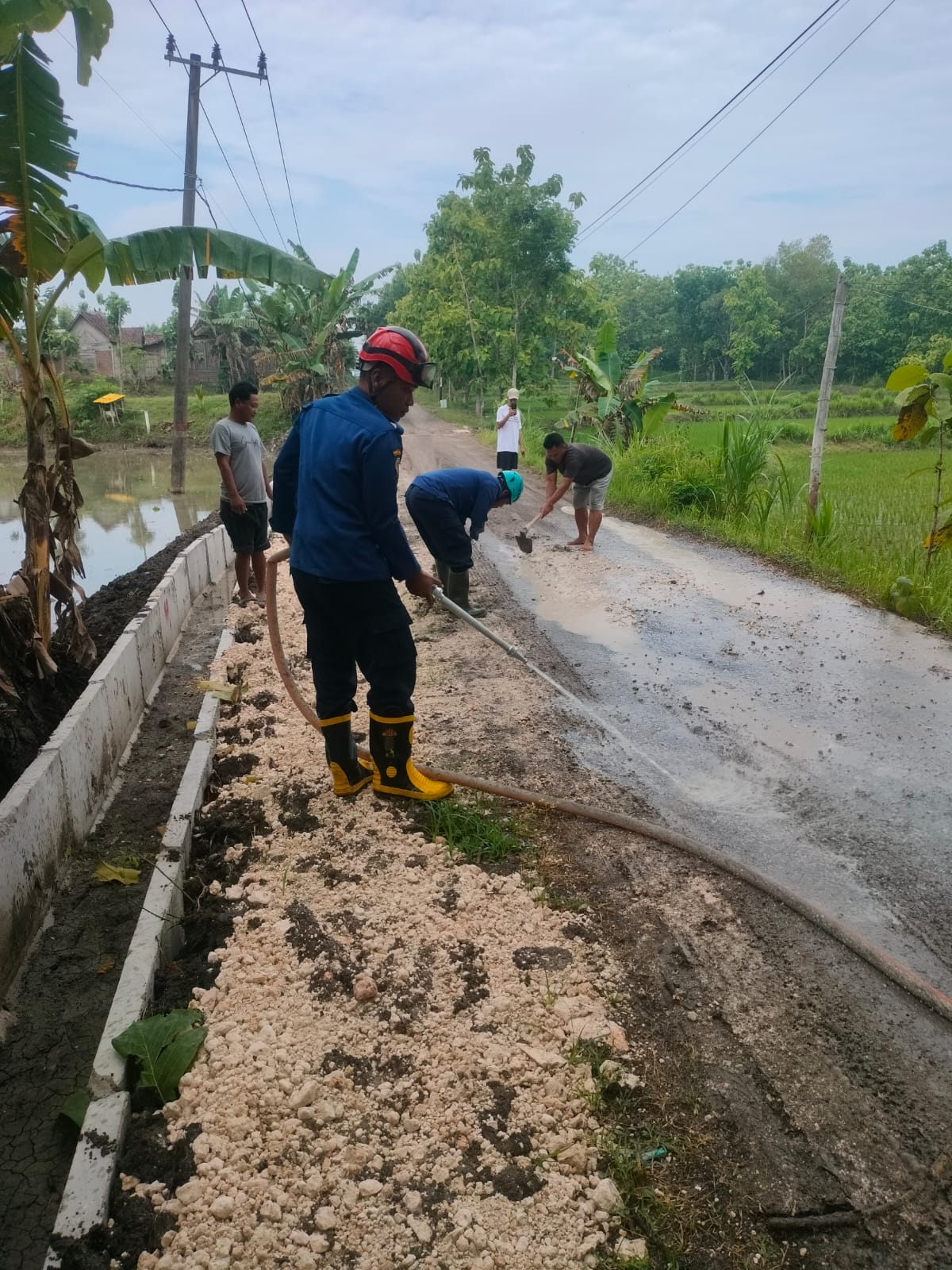 Bojonegoro – Petugas Dinas Pemadam Kebakaran dan Penyelamatan (Damkarmat) Kabupaten Bojonegoro Pos Ngraho, Regu 2, melaksanakan giat penyemprotan tumpahan cor yang membahayakan...
